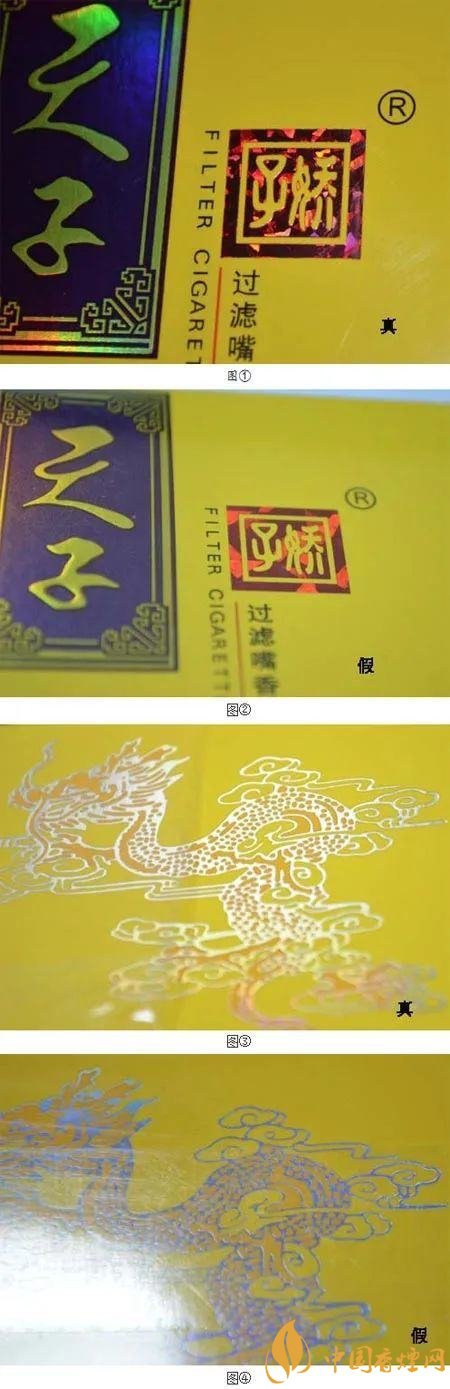 “天子”兩字。真煙顏色純正,清晰無雜質;假煙則常有粘連、雜質,顏色漸變褪色。
