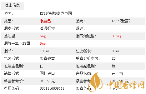 (注:08年四月份左右愛喜推出新款香煙,長(zhǎng)度和粗度均和普通香煙一樣,成分和口味均和和原來細(xì)長(zhǎng)型愛喜并無分別。新款愛喜的煙盒和老款也有所區(qū)別,和上面的圖有一點(diǎn)不一樣,在新款愛喜彈劾“ESSE”的商標(biāo)左面會(huì)多出“Menthol”的字樣。)