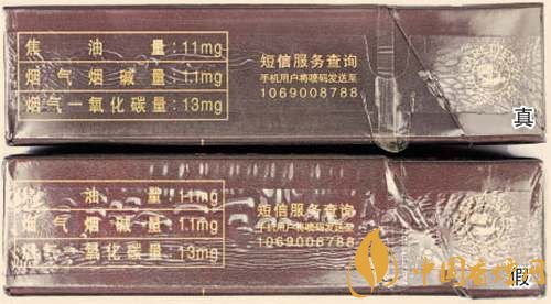 真煙商標(biāo)紙采用復(fù)合鐳射銀卡紙,膠印和絲網(wǎng)印刷,“和天下”字體采用壓凸?fàn)C金工藝,用手摸凹凸感較明顯,且字體筆畫較粗,商標(biāo)紙上字體、拼音、花紋看上去有較清晰的豎線;假煙一般為高清掃描仿制印刷,“和天下”字體用手摸凹凸感不明顯,且字體筆畫較細(xì),商標(biāo)紙上拼音、花紋等處豎線較模糊。