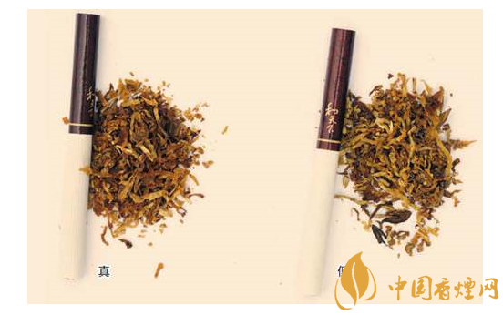 四、煙支過濾嘴及煙絲差異對比:真煙煙支采用復合濾嘴,煙絲切絲寬度均勻,煙絲疏松、光澤油潤性好、呈檸檬黃色,煙絲結(jié)構(gòu)為葉絲和少量膨脹梗絲;假煙煙支采用普通濾嘴,制絲工藝簡單,煙絲寬度不均勻,有少量梗絲,未經(jīng)過膨脹處理。