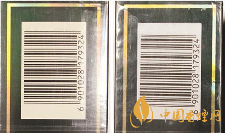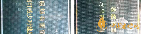 煙用包裝膜材質(zhì)及條形碼對(duì)比:真品卷煙條包裝膜材質(zhì)光滑,均勻無(wú)皺褶,條形碼區(qū)域呈淡黃色,套色均勻清楚。假煙條包裝膜材質(zhì)粗糙,有不均勻皺褶,條形碼區(qū)域?yàn)榘咨?,套色邊緣放大后模糊不清?/p>