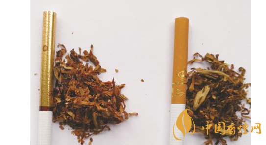 煙絲差異對比:真煙煙絲切絲寬度均勻,煙絲疏松、光澤油潤性好,呈檸檬黃色,煙絲結(jié)構(gòu)為純?nèi)~絲;假煙煙絲切絲寬度不勻,光澤油潤性較差,煙絲結(jié)構(gòu)為葉絲和少量梗絲,與真品特征存在明顯差異。