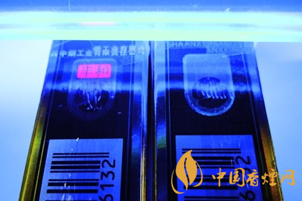 商標紙印刷工藝差異對比:真品小盒商標紙選用光柱鐳射卡紙,采用凹凸燙金一次成型技術,小盒正面商標圖案和字跡清晰且凹凸感明顯,燙金部分光滑無格紋狀;假煙小盒仿制粗糙,燙金套印不準,商標圖案部分仿印有明顯的格紋狀,與真品印刷工藝存在明顯差異。