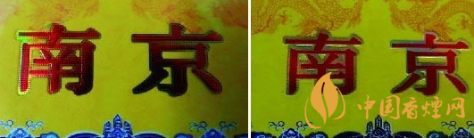 小盒商標紙印刷工藝差異比對:真品卷煙小盒商標紙“南京”字體印刷由無數(shù)個相等小圓點組合而成且立體感強,印刷工藝水平技術含量高,不易被仿制印刷;假煙小盒商標紙“南京”字體采用普通仿制套印燙金工藝,字體沒有立體感和線條層次感,套印燙金工藝粗糙且邊緣有毛渣,與真品印刷工藝差異明顯。