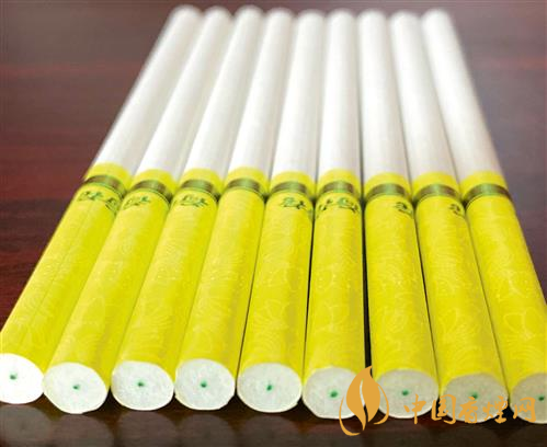 觀察煙支。真品煙支長(zhǎng)度為97mm,接裝紙長(zhǎng)度為36mm,嘴棒長(zhǎng)度為30mm。接裝紙為黃綠色,帶燙金“荷花”字樣及整圈燙金花紋,使用專版小方格卷煙紙,內(nèi)置加香亮鮮綠線醋酸濾棒,煙支端口平齊無(wú)毛茬。