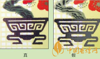 3.看“花盆”圖案:真品卷煙的花盆為咖啡色,花盆底層的網(wǎng)格狀紋路隱約可見(jiàn);假冒卷煙的花盆大多為黑色,顏色較深,看不到花盆底層的網(wǎng)格狀紋路。