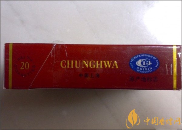 煙盒的左側標注著英文字母“CHUNG HWA”和藍色的防偽標簽。中華的出產方。